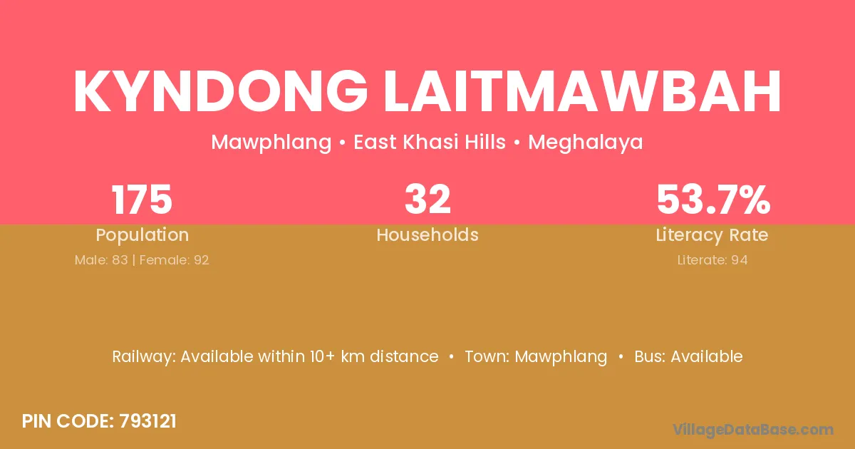 Kyndong Laitmawbah village has a total population of 175 people, of which 83 are males and 92 are females.