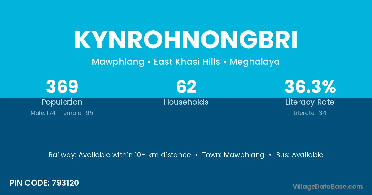 Kynrohnongbri village has a total population of 369 people, of which 174 are males and 195 are females.