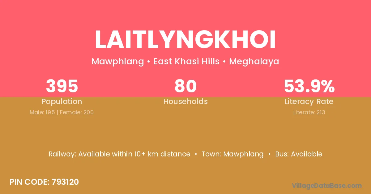 Laitlyngkhoi village has a total population of 395 people, of which 195 are males and 200 are females.