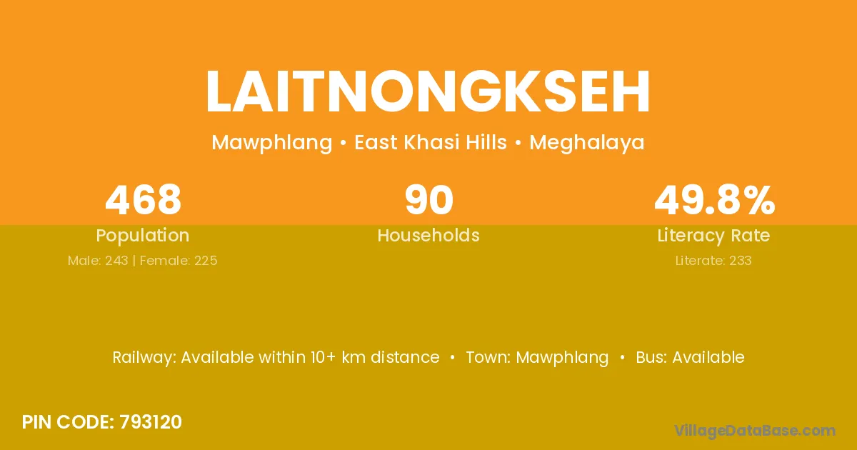 Laitnongkseh village has a total population of 468 people, of which 243 are males and 225 are females.