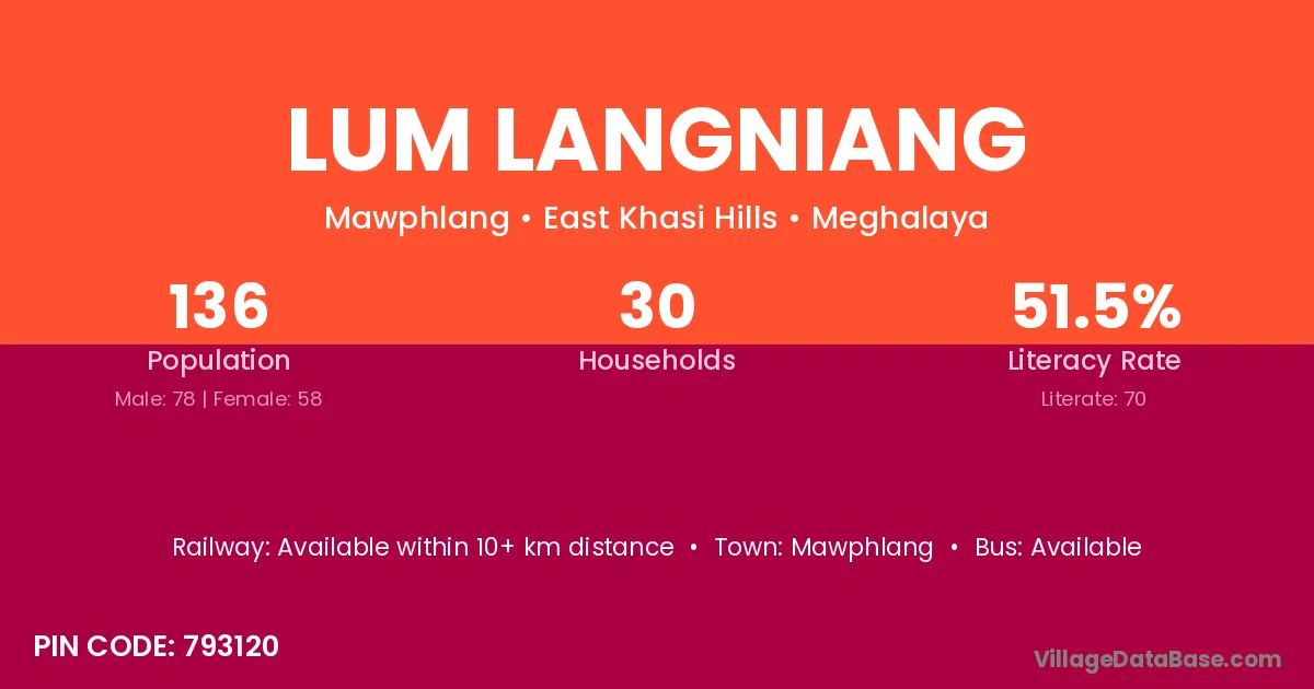 The literacy rate of Lum Langniang village is 51.47%. Male literacy stands at 52.56% and female literacy at 50.00%.