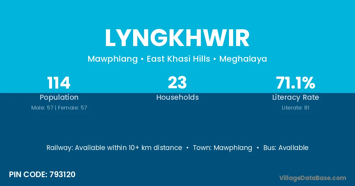 Lyngkhwir village has a total population of 114 people, of which 57 are males and 57 are females.