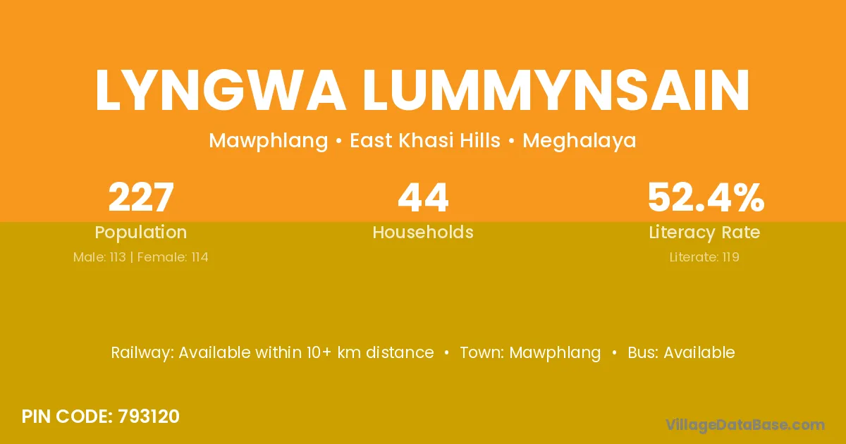 Lyngwa Lummynsain village has a total population of 227 people, of which 113 are males and 114 are females.