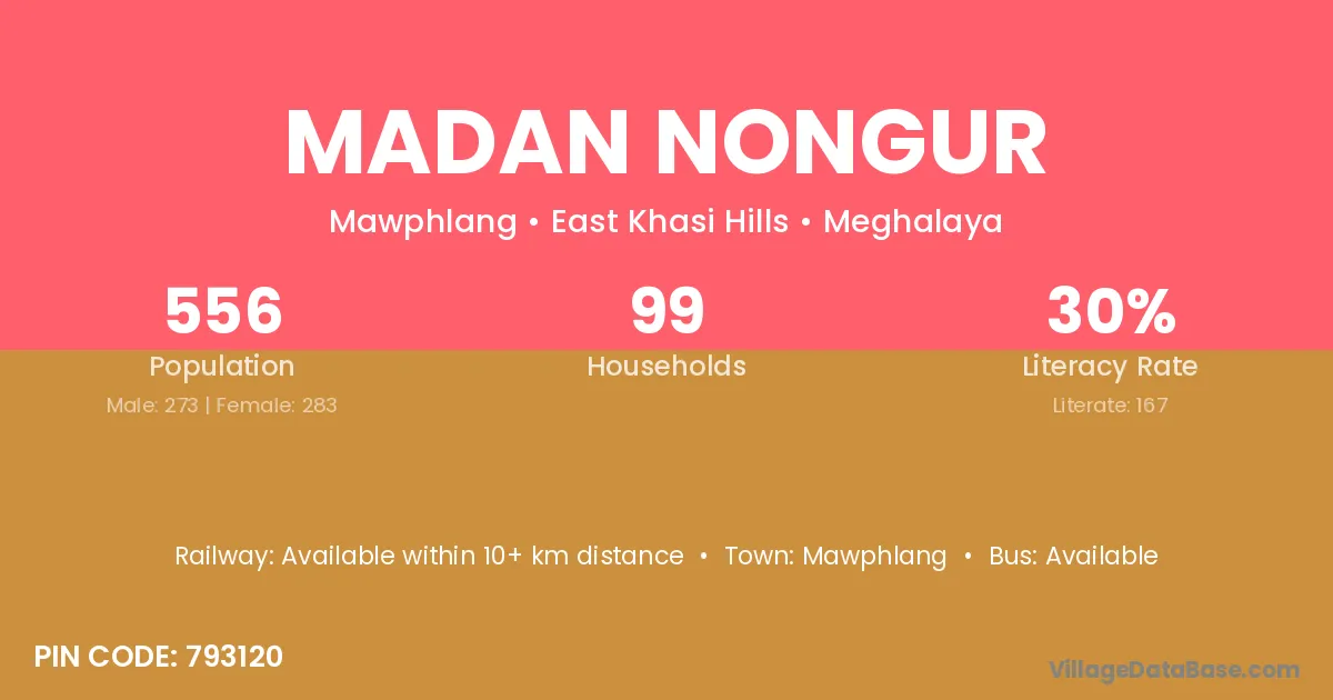 Madan Nongur village has a total population of 556 people, of which 273 are males and 283 are females.