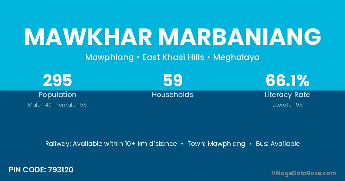 Mawkhar Marbaniang village has a total population of 295 people, of which 140 are males and 155 are females.