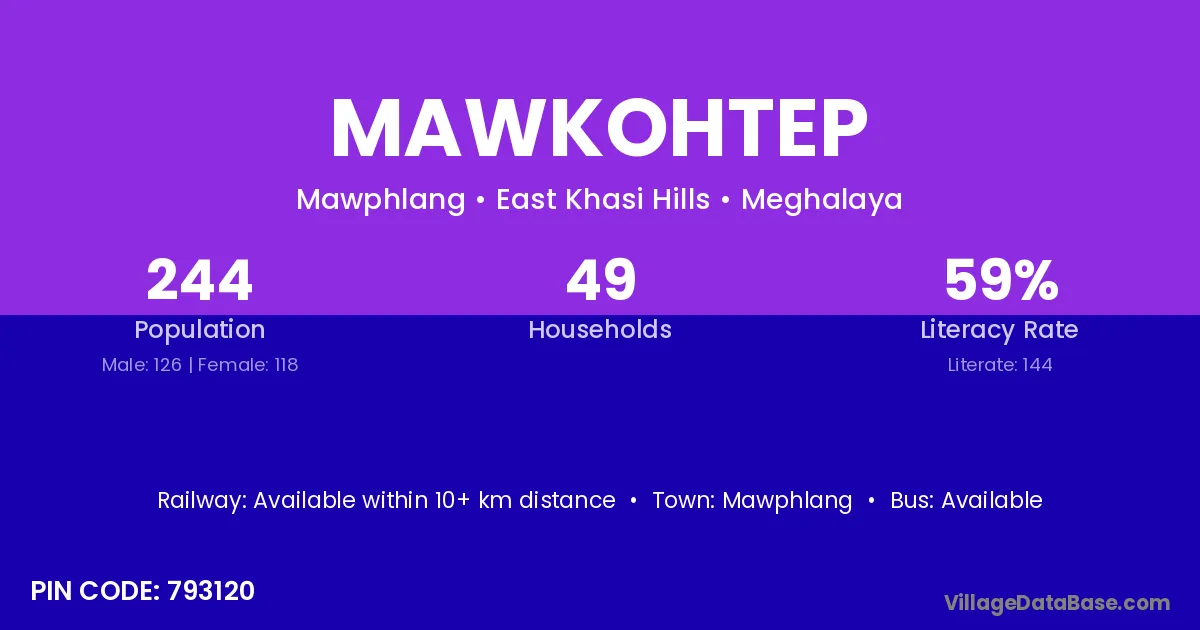 The literacy rate of Mawkohtep village is 59.02%. Male literacy stands at 58.73% and female literacy at 59.32%.