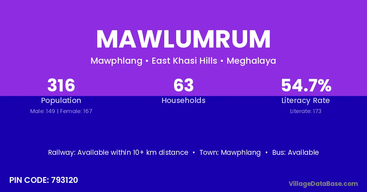 Mawlumrum village has a total population of 316 people, of which 149 are males and 167 are females.