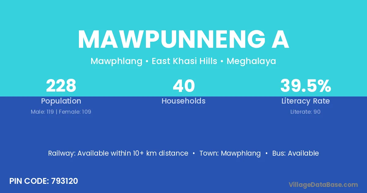 Mawpunneng A village has a total population of 228 people, of which 119 are males and 109 are females.
