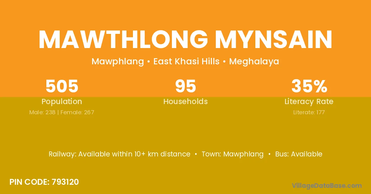 Mawthlong Mynsain village has a total population of 505 people, of which 238 are males and 267 are females.