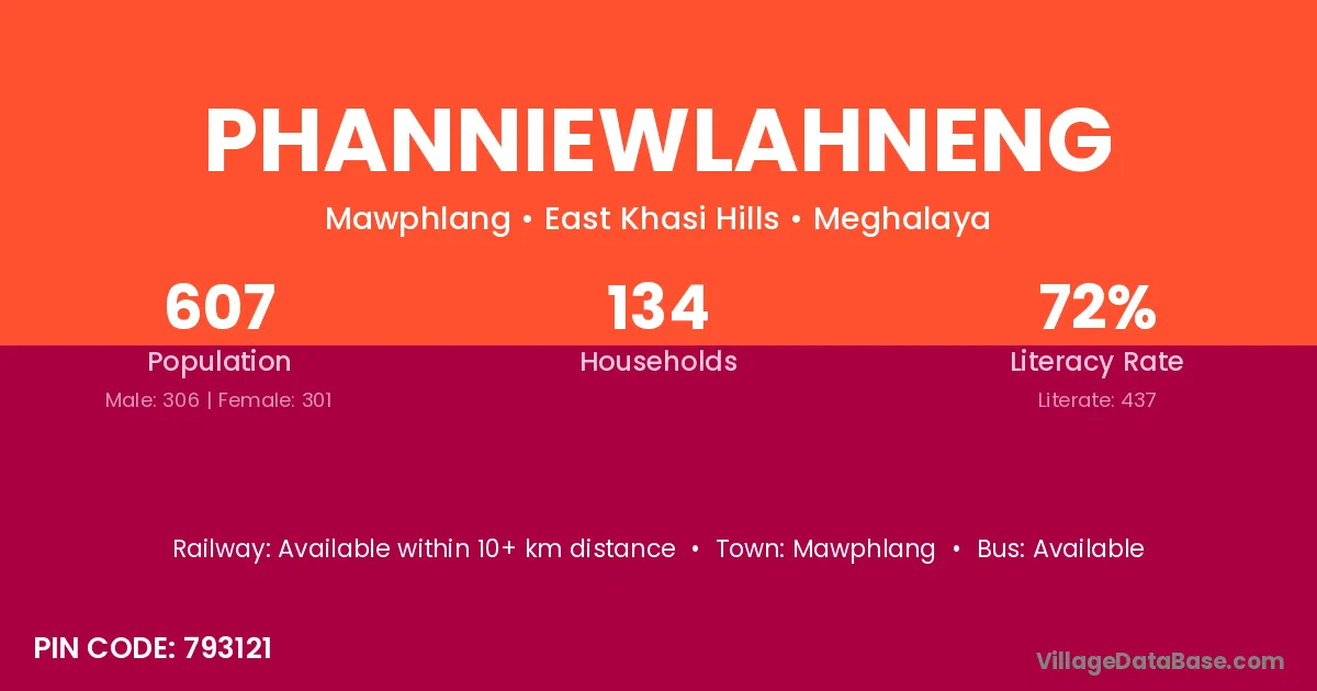 Phanniewlahneng village has a total population of 607 people, of which 306 are males and 301 are females.