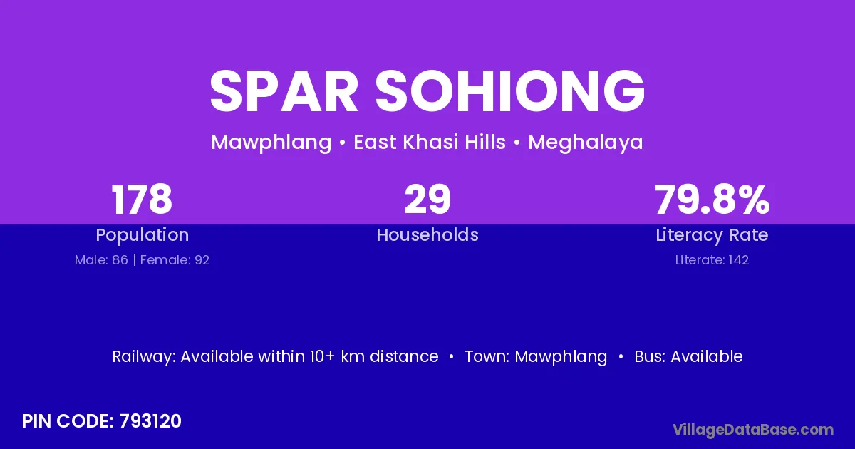 Spar Sohiong village has a total population of 178 people, of which 86 are males and 92 are females.