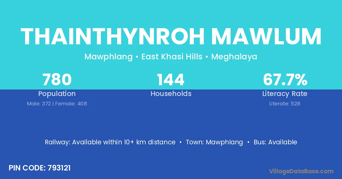 Thainthynroh Mawlum village has a total population of 780 people, of which 372 are males and 408 are females.