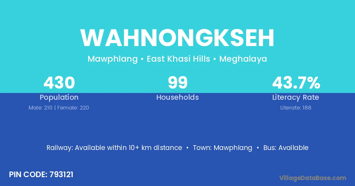 Wahnongkseh village has a total population of 430 people, of which 210 are males and 220 are females.