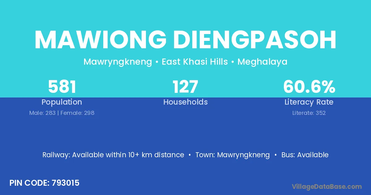 Mawiong Diengpasoh village has a total population of 581 people, of which 283 are males and 298 are females.