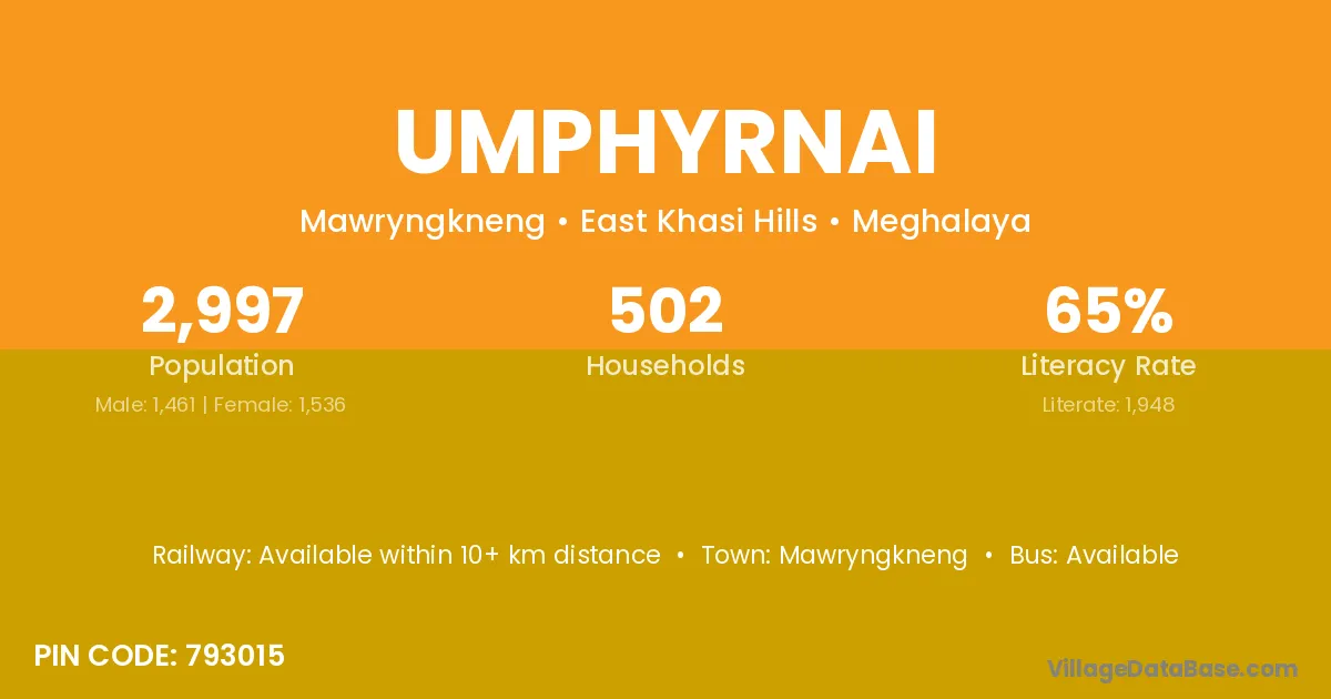 Umphyrnai village has a total population of 2,997 people, of which 1,461 are males and 1,536 are females.