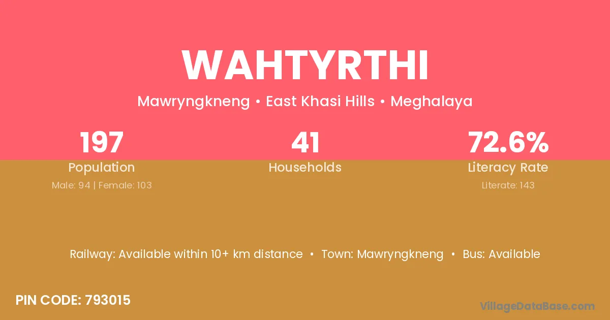 Wahtyrthi village has a total population of 197 people, of which 94 are males and 103 are females.