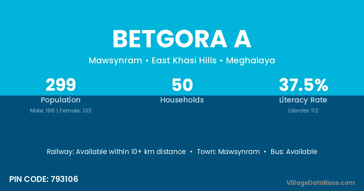 Betgora A village has a total population of 299 people, of which 166 are males and 133 are females.