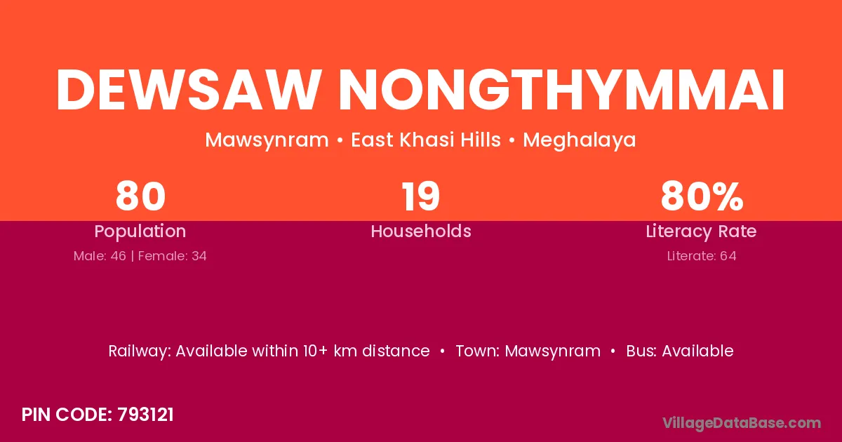 Dewsaw Nongthymmai village has a total population of 80 people, of which 46 are males and 34 are females.