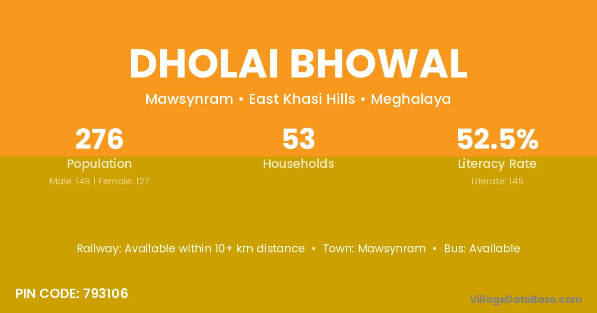 Mawsynram is the nearest town to Dholai Bhowal village for major economic activities
