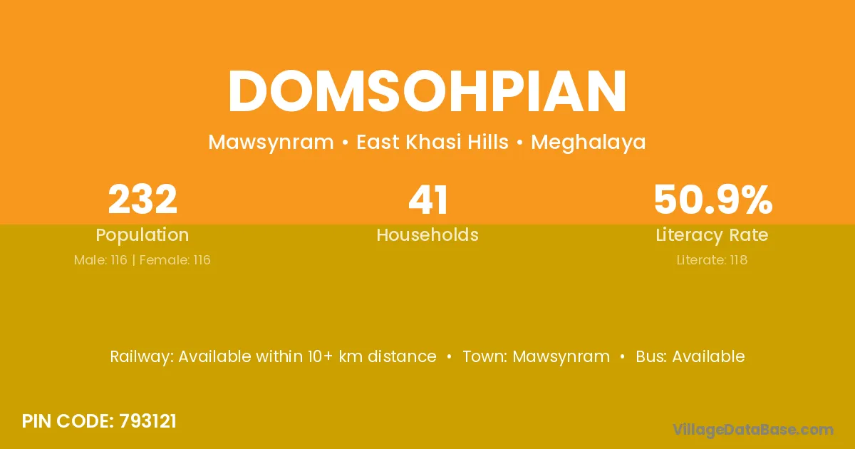 Domsohpian village has a total population of 232 people, of which 116 are males and 116 are females.