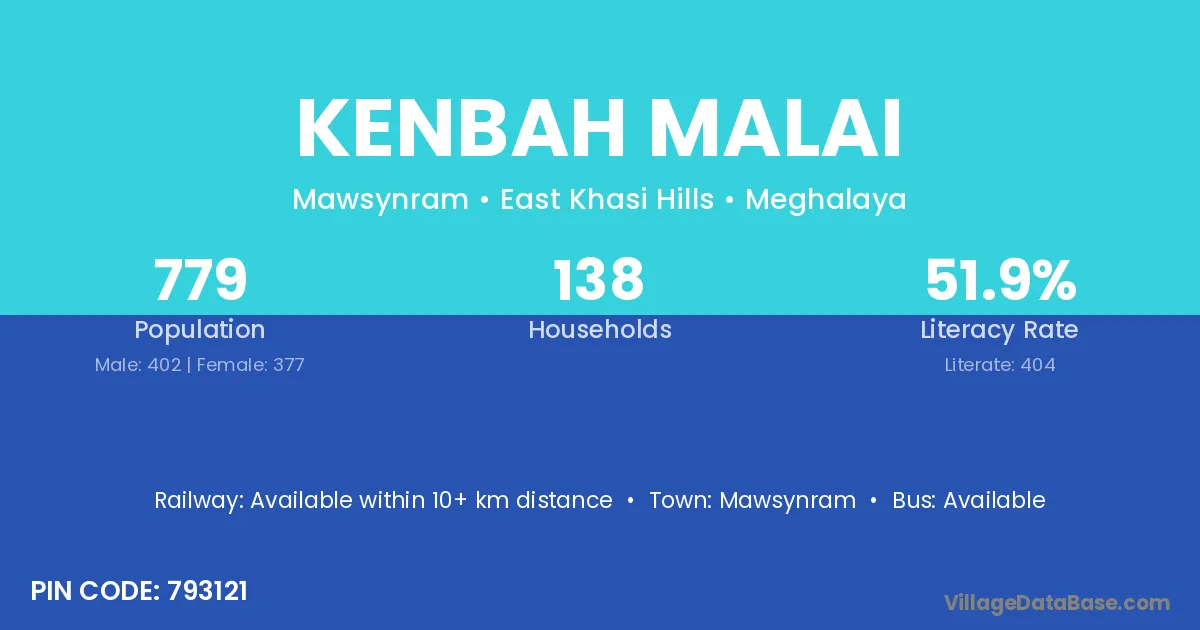 Kenbah Malai village has a total population of 779 people, of which 402 are males and 377 are females.