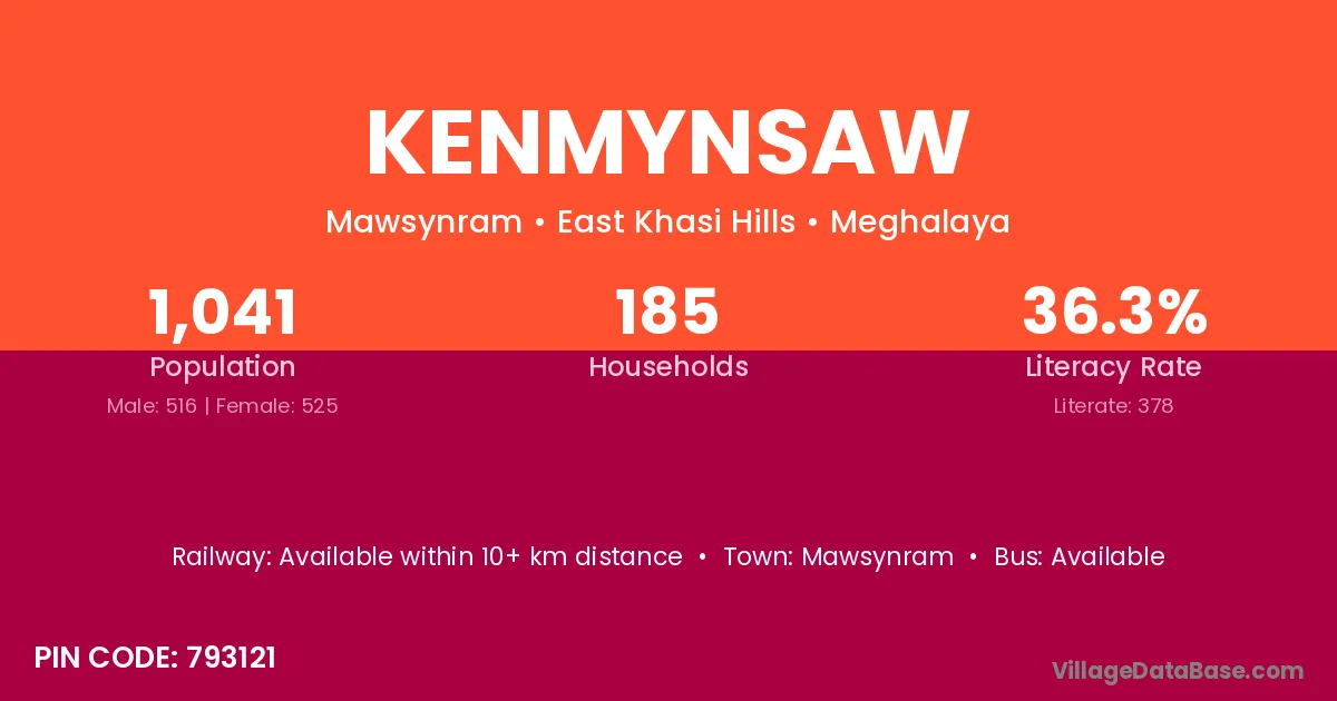 The literacy rate of Kenmynsaw village is 36.31%. Male literacy stands at 38.95% and female literacy at 33.71%.