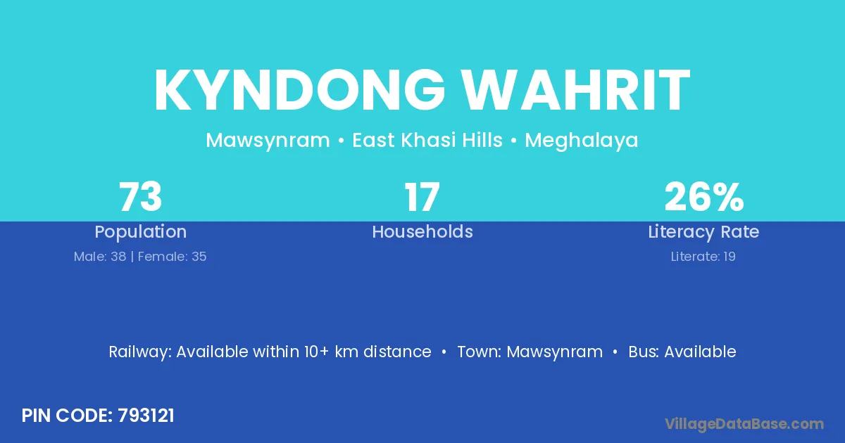 Kyndong Wahrit village has a total population of 73 people, of which 38 are males and 35 are females.