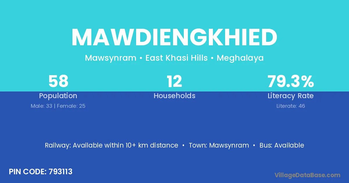 Mawdiengkhied village has a total population of 58 people, of which 33 are males and 25 are females.