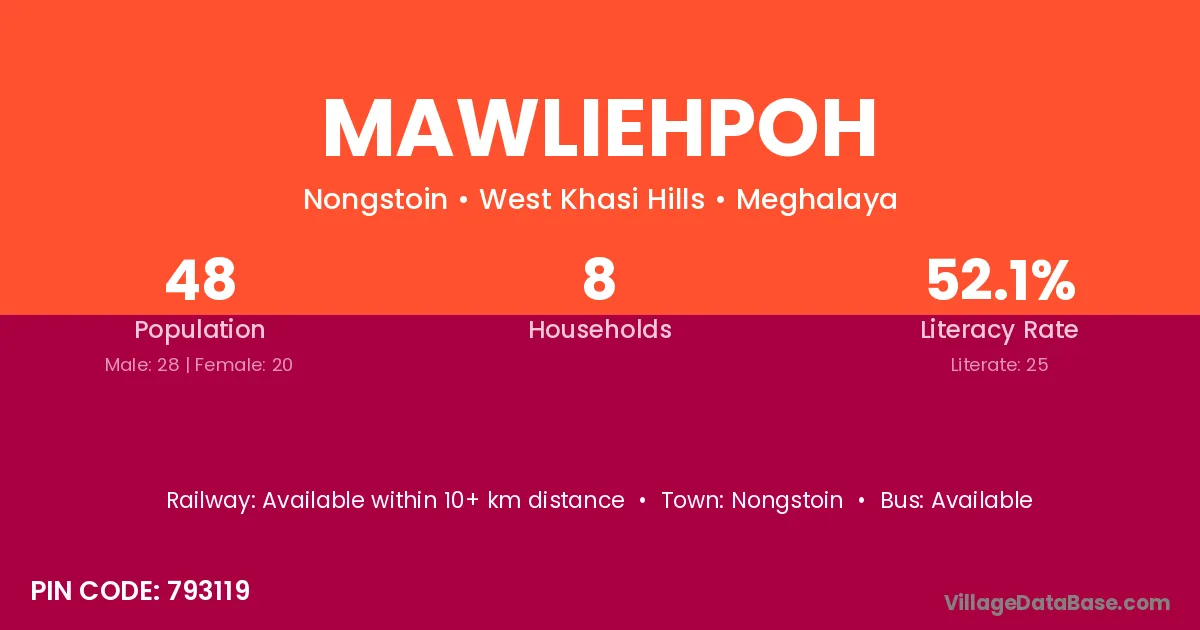 The literacy rate of Mawliehpoh village is 58.96%. Male literacy stands at 55.10% and female literacy at 62.50%.