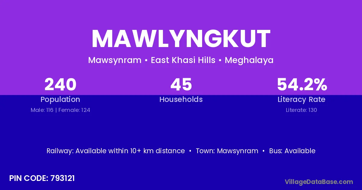 Mawlyngkut village has a total population of 240 people, of which 116 are males and 124 are females.