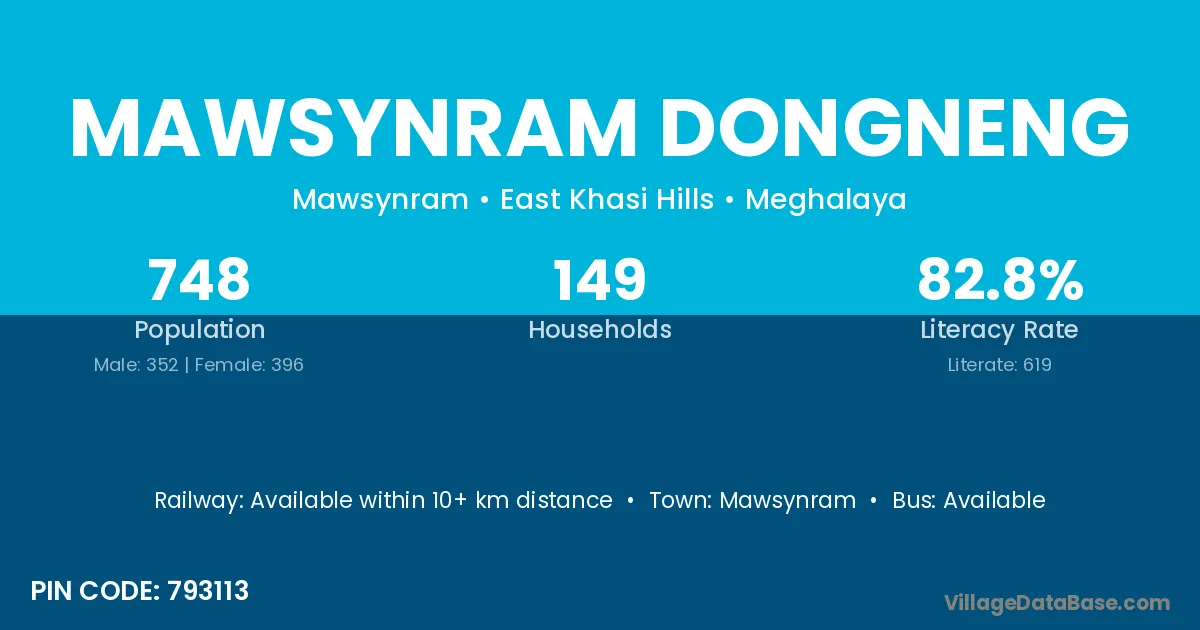 Mawsynram Dongneng village has a total population of 748 people, of which 352 are males and 396 are females.