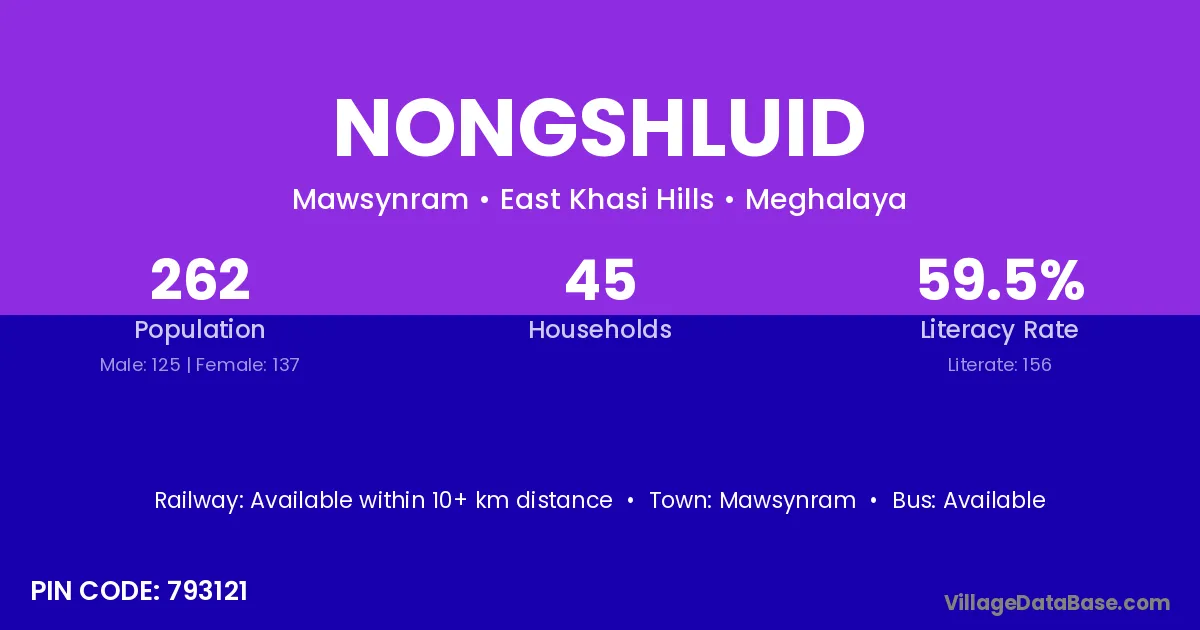 Nongshluid village has a total population of 262 people, of which 125 are males and 137 are females.