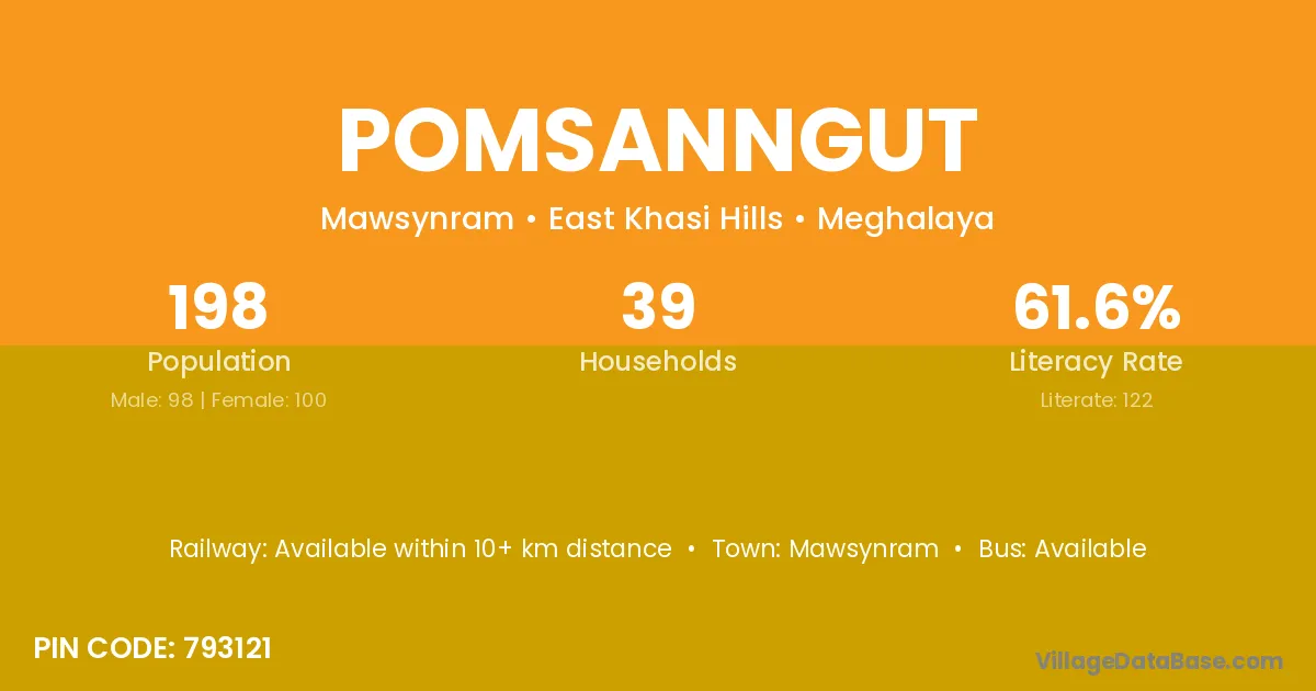 Mawsynram is the nearest town to Pomsanngut village for major economic activities