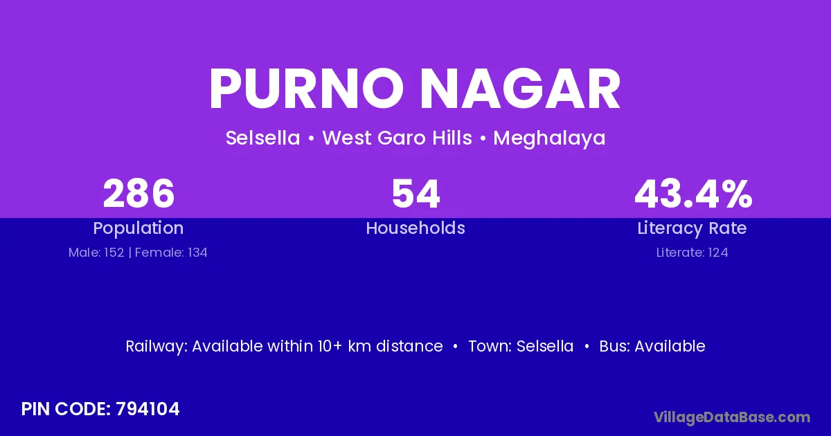 Mawsynram is the nearest town to Purno Nagar village for major economic activities