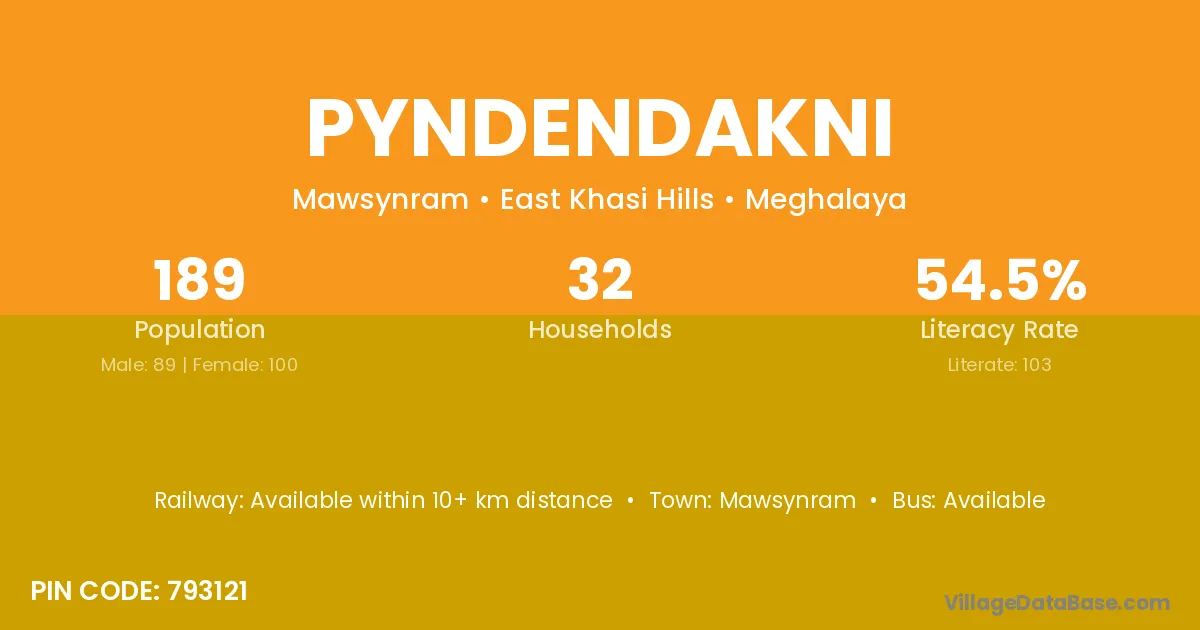 Pyndendakni village has a total population of 189 people, of which 89 are males and 100 are females.