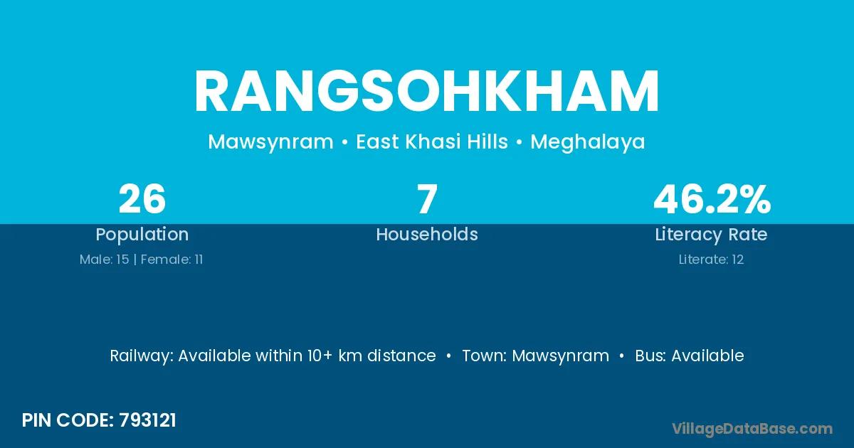 Rangsohkham village has a total population of 26 people, of which 15 are males and 11 are females.