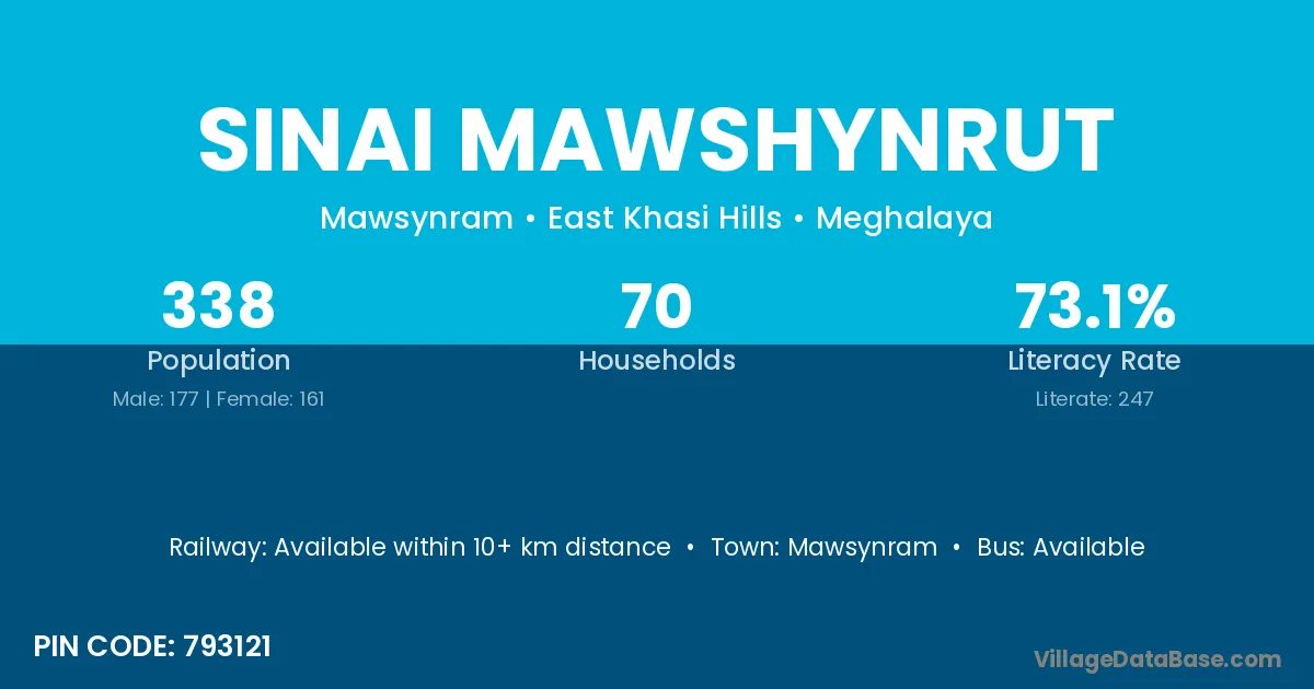 Sinai Mawshynrut village has a total population of 338 people, of which 177 are males and 161 are females.