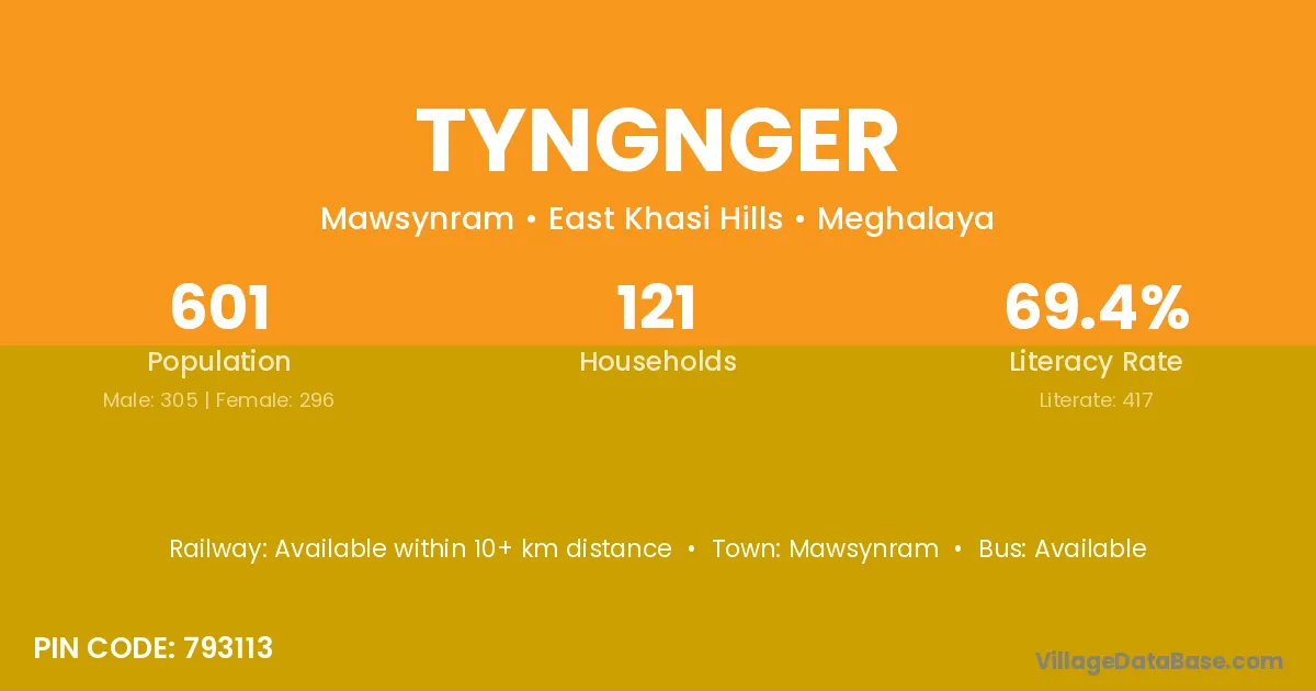Tyngnger village has a total population of 601 people, of which 305 are males and 296 are females.