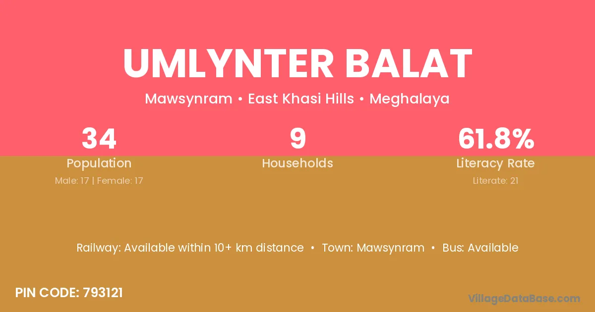 Umlynter Balat village has a total population of 34 people, of which 17 are males and 17 are females.