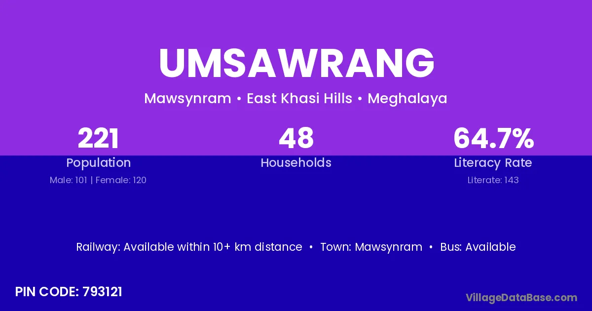 Umsawrang village has a total population of 221 people, of which 101 are males and 120 are females.