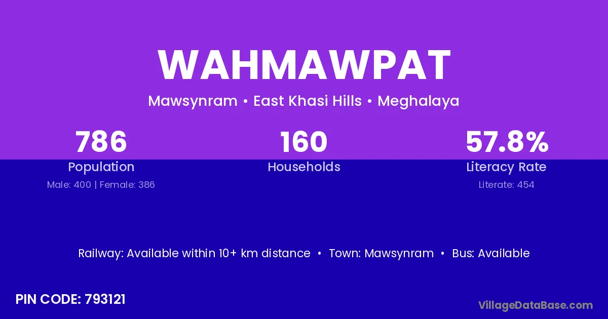 Wahmawpat village has a total population of 786 people, of which 400 are males and 386 are females.