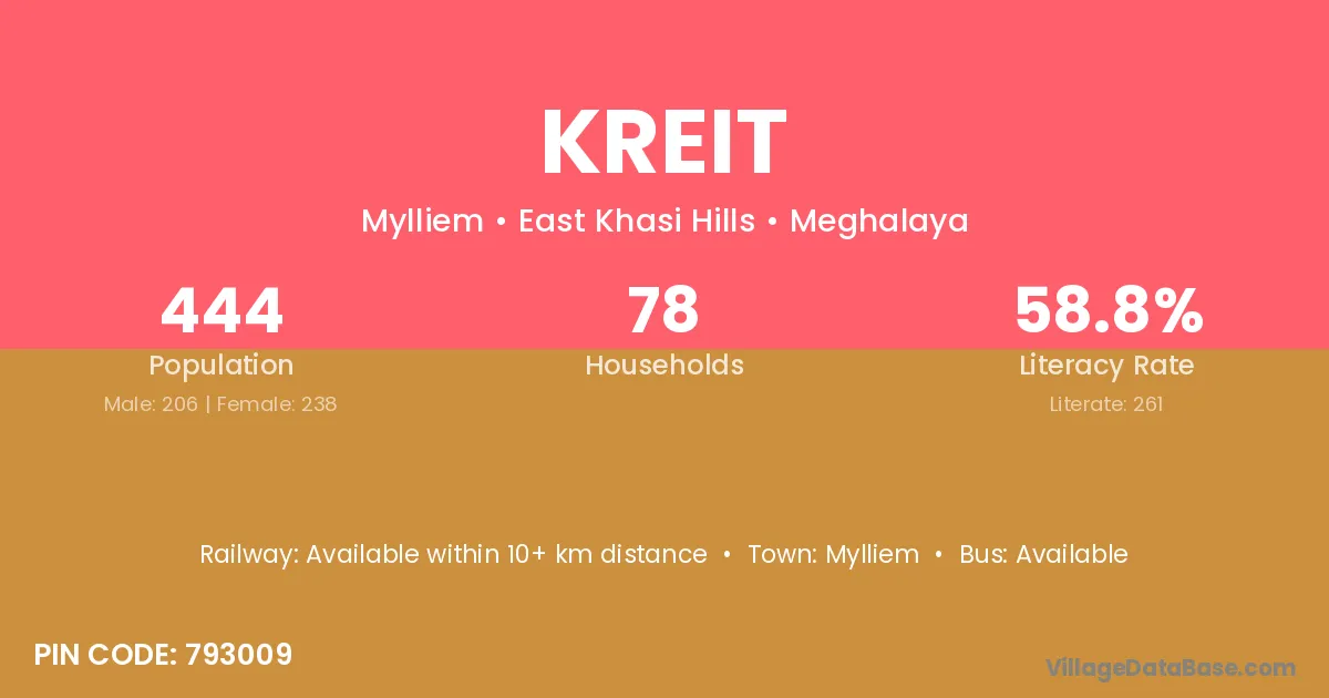 The literacy rate of Kreit village is 58.78%. Male literacy stands at 50.00% and female literacy at 66.39%.
