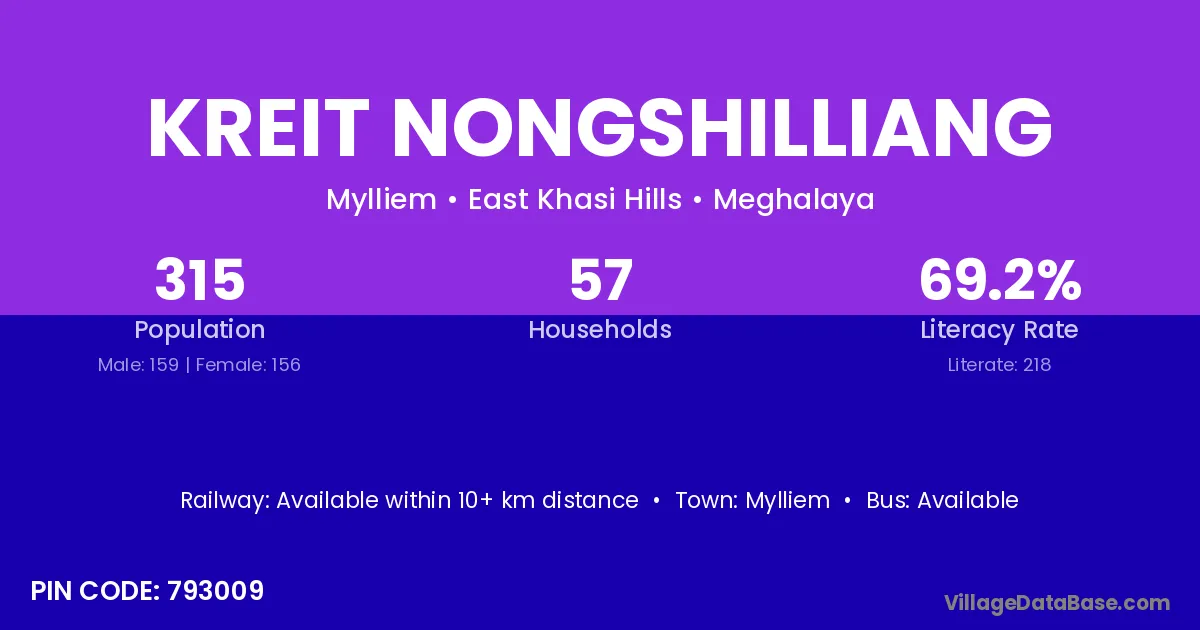 Kreit Nongshilliang village has a total population of 315 people, of which 159 are males and 156 are females.