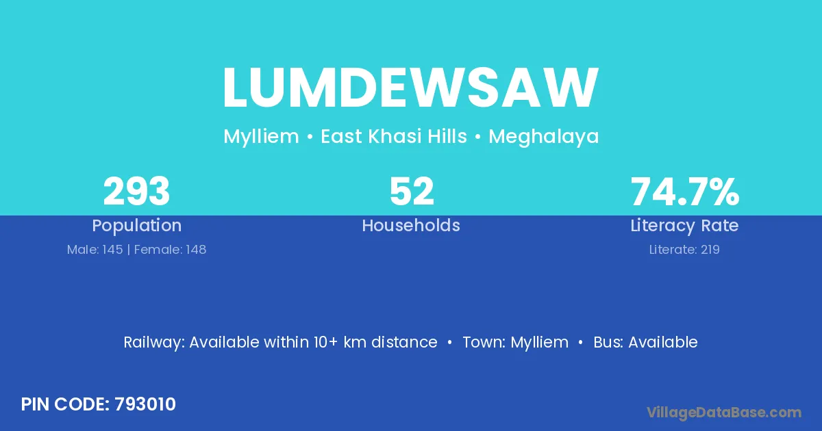 Lumdewsaw village has a total population of 293 people, of which 145 are males and 148 are females.