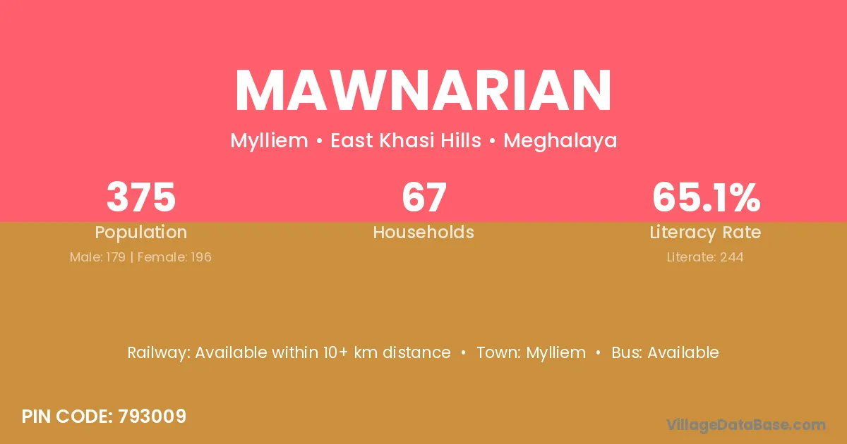 Mawnarian village has a total population of 375 people, of which 179 are males and 196 are females.