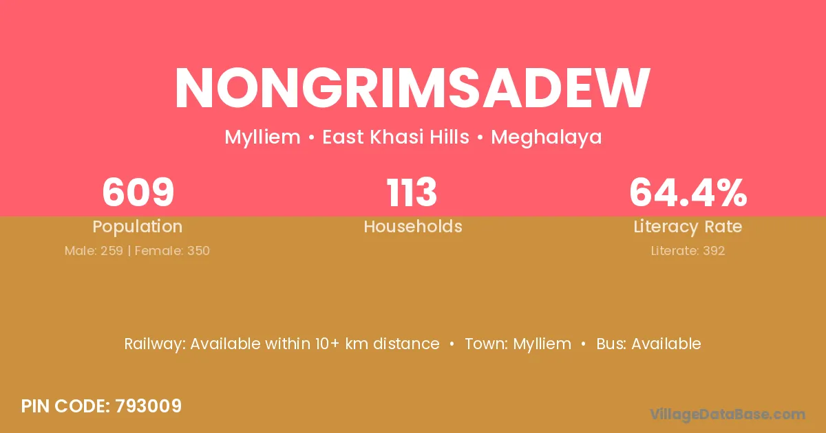 Nongrimsadew village has a total population of 609 people, of which 259 are males and 350 are females.