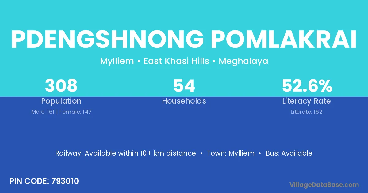 Pdengshnong Pomlakrai village has a total population of 308 people, of which 161 are males and 147 are females.