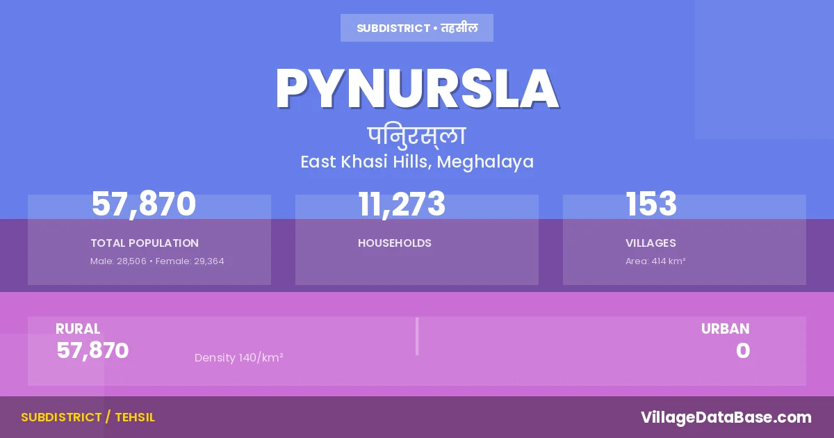 According to the 2011 census The total area of Pynursla Subdivision is 414 km², with a population of 57870 people. The population density is 140 inhabitants per square kilometre, and there are approximately 11273 houses in the sub district.