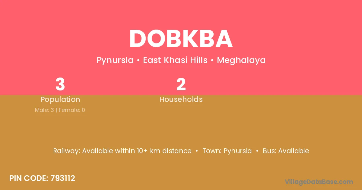 Dobkba village has a total population of 3 people, of which 3 are males and 0 are females.