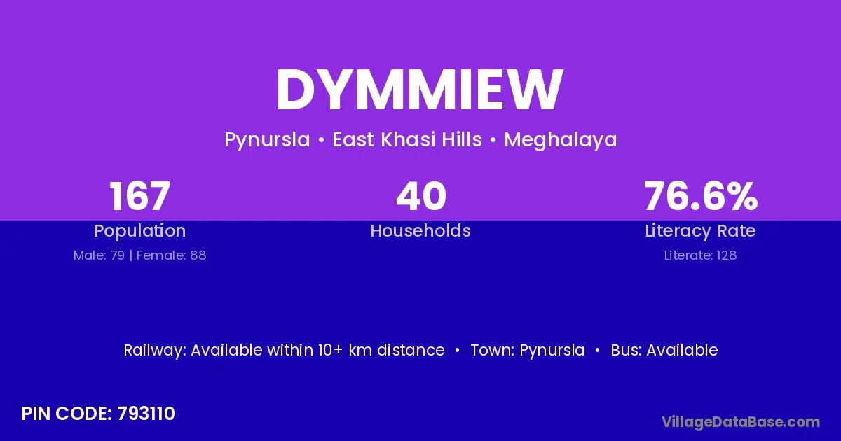 The literacy rate of Dymmiew village is 76.65%. Male literacy stands at 75.95% and female literacy at 77.27%.